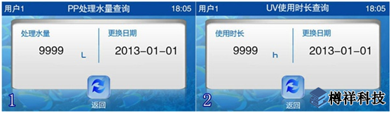 ◇ 在耗材使用查詢畫面中點擊UV使用時長,出現(xiàn)UV使用時長查詢畫面(圖2)。畫面顯示已處理水量及前次更換耗材日期。