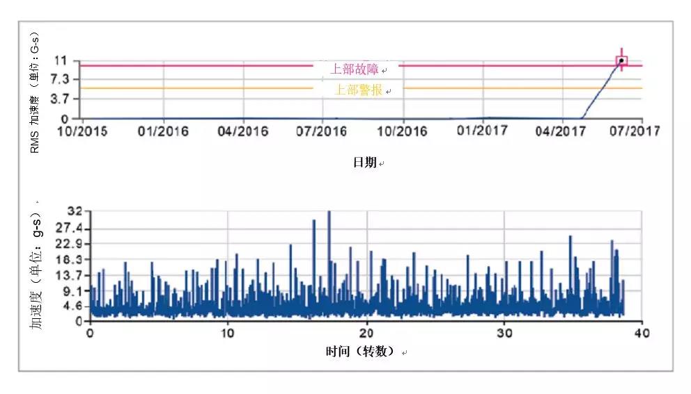 但這些沖擊是隨機(jī)的,有些可能會(huì)大到32 G-s。還請(qǐng)注意,在圖表中,沖擊突然開(kāi)始達(dá)到***報(bào)警故障水平。這表明潤(rùn)滑不足。